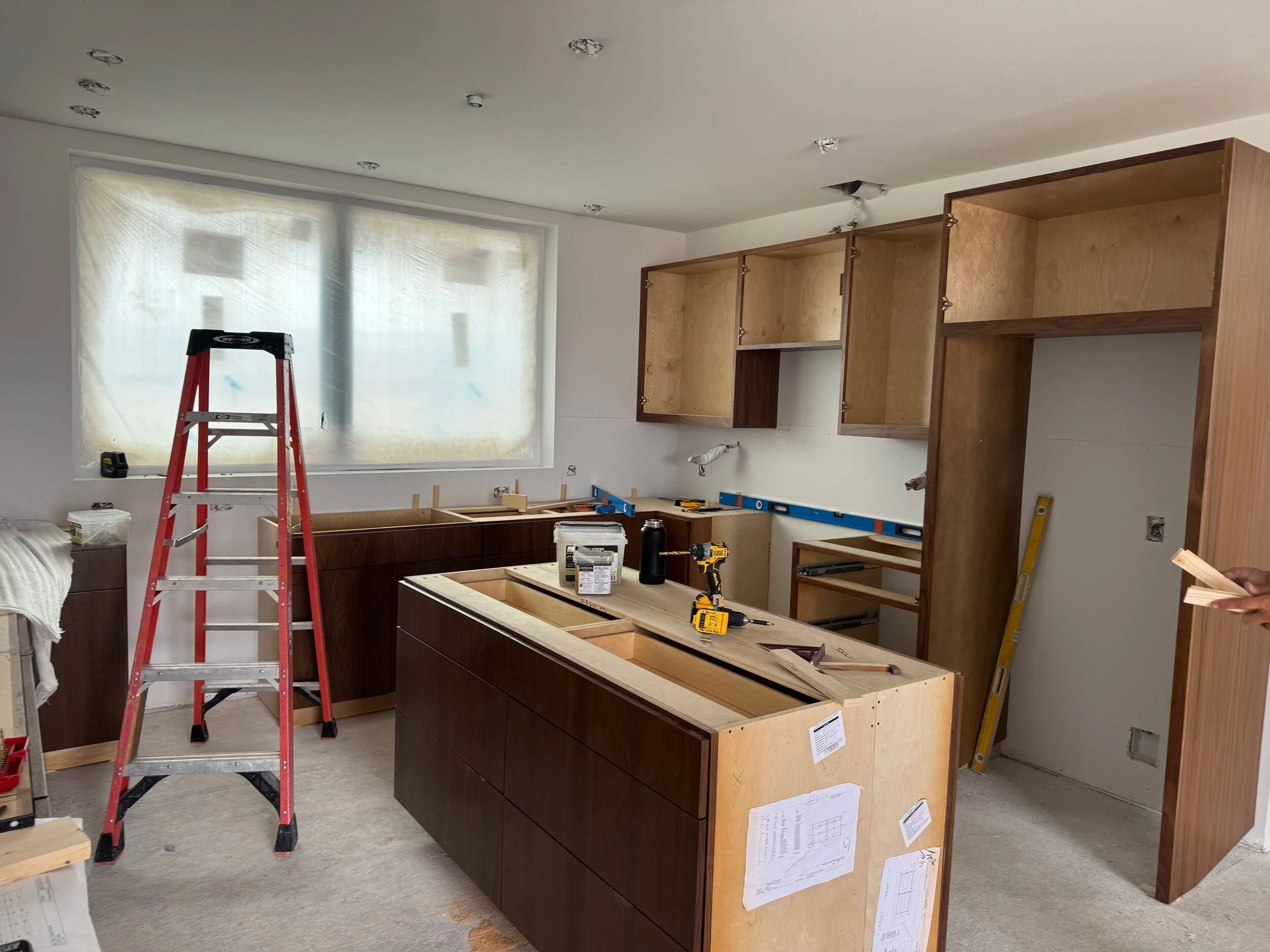 The sleek, vertical-grain walnut kitchen cabinets are now in place, setting the tone for the warm, modern look we envisioned. The island, lower cabinetry, and upper storage are installed, with precision work underway to align all components perfectly. One notable detail is the “Black Fox” cabinet capping—now fitted—adding a strong, modern contrast to the wood tones.