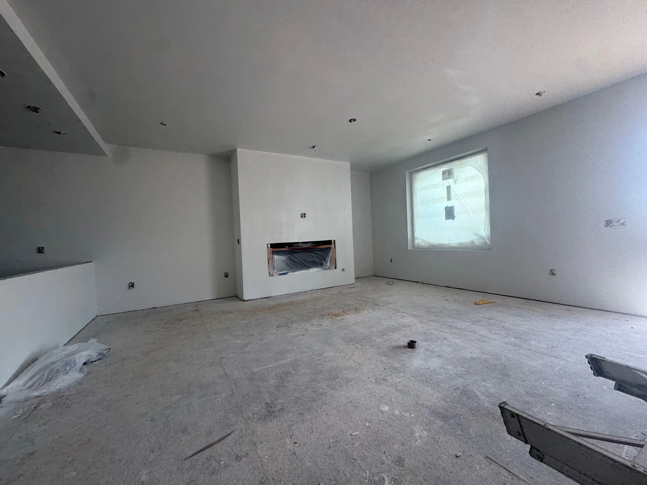 In the main living area, drywall finishing and painting are complete, and the fireplace is ready for its floor-to-ceiling tile accent. This feature will anchor the space, creating a comfortable focal point for future homeowners.