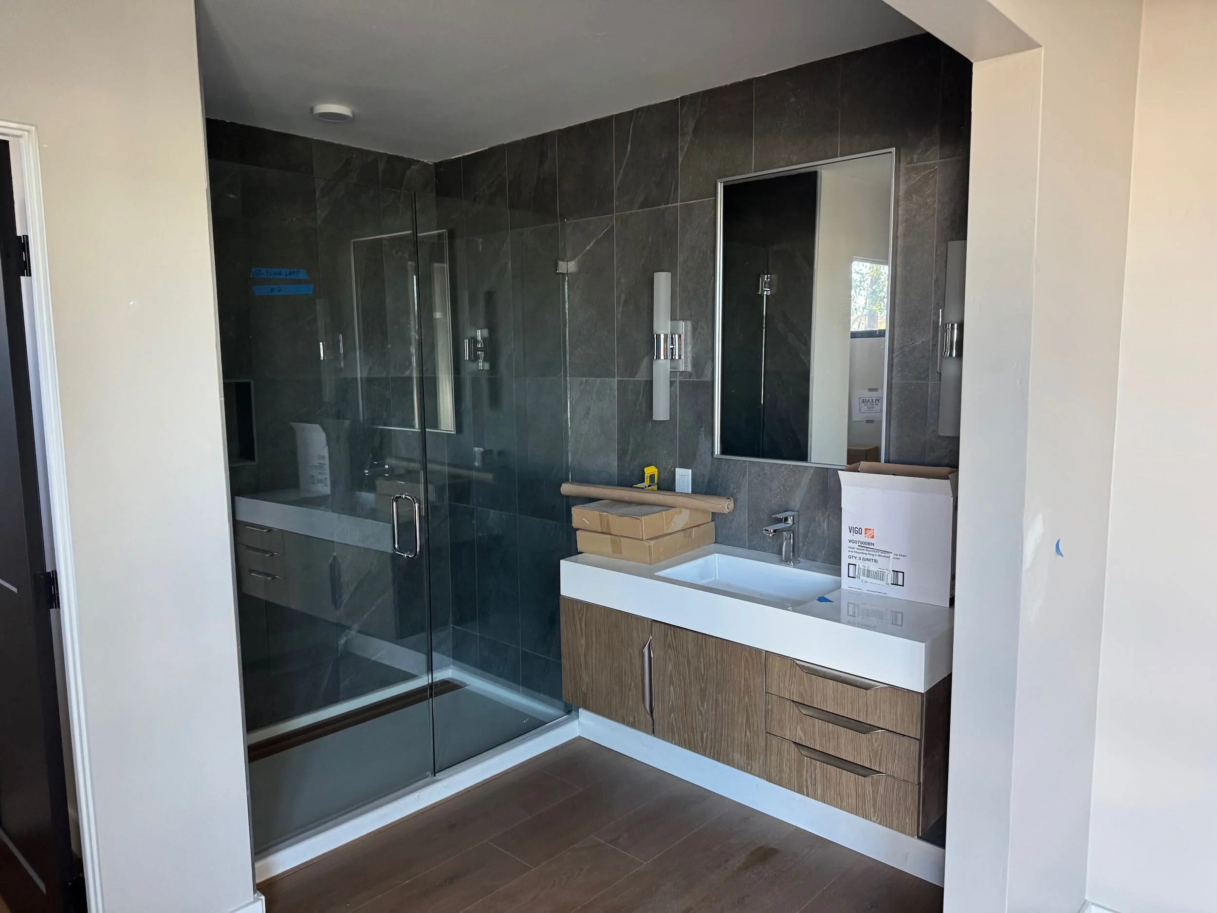 In this example of the smaller suite bathrooms, the shower glass has now been installed, completing the floor-to-ceiling dark tile enclosure. The combination of the floating vanity, polished fixtures, and clean glass lines creates a modern, spa-like atmosphere.