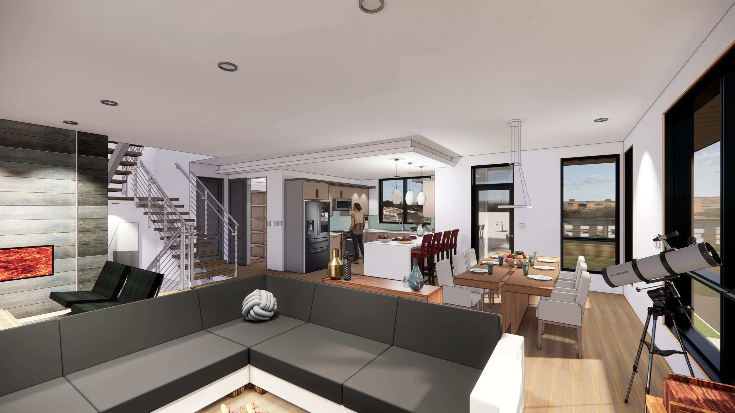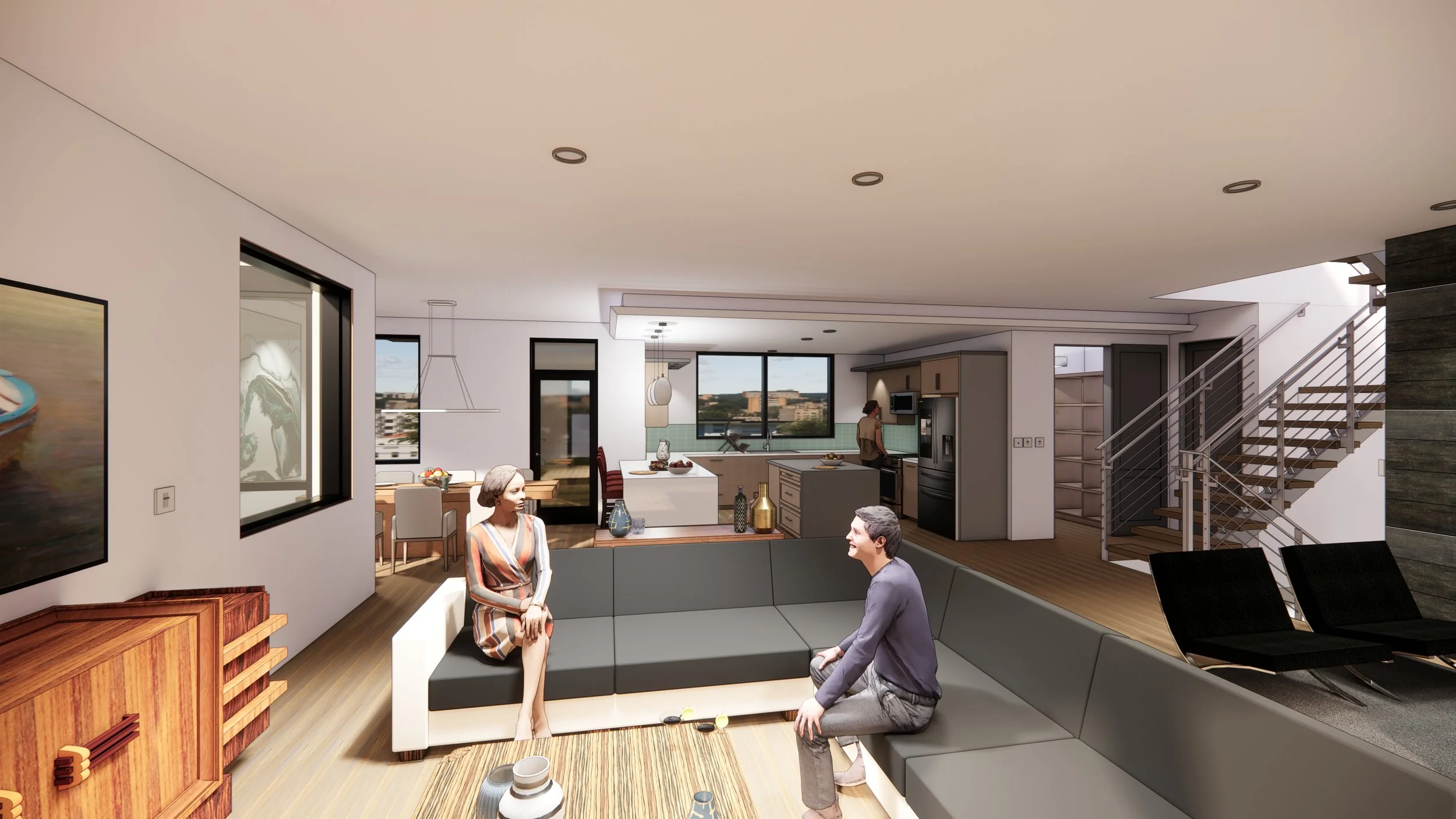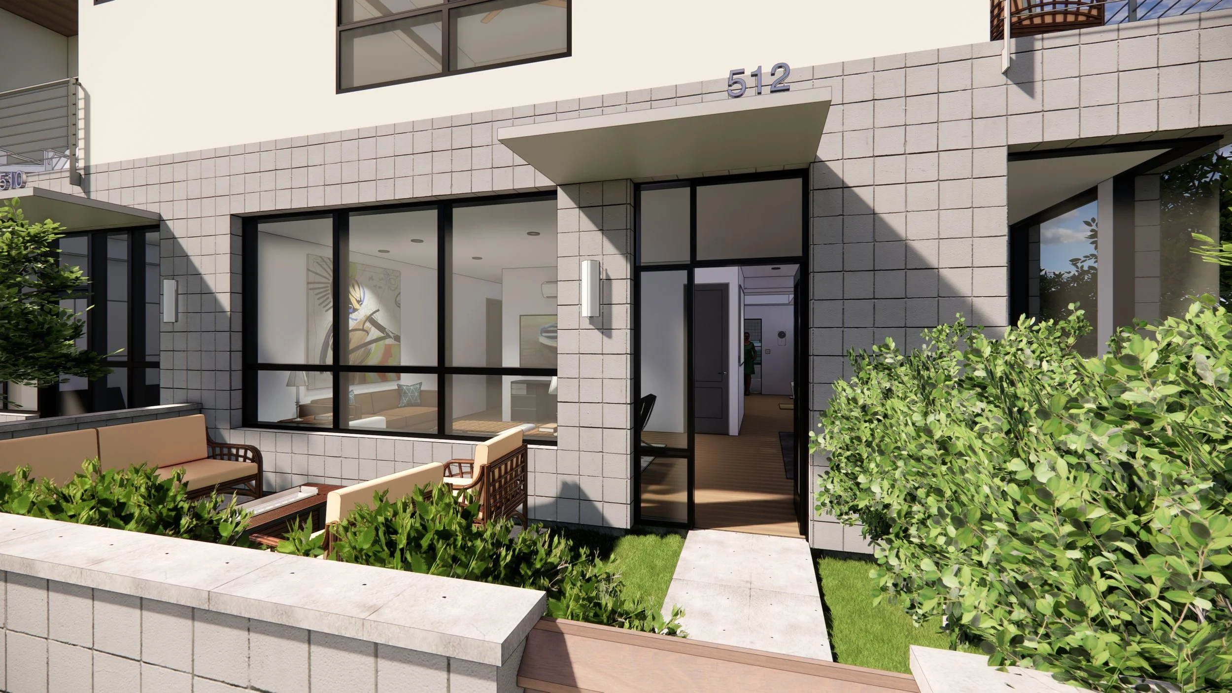 A ground floor living space featuring a private bedroom, full-size bathroom, large kitchen, separate living and dining areas plus two outdoor patios. All in a spacious 1,085 square feet of ADA compliant living space and over 373 square feet of private outdoor space.